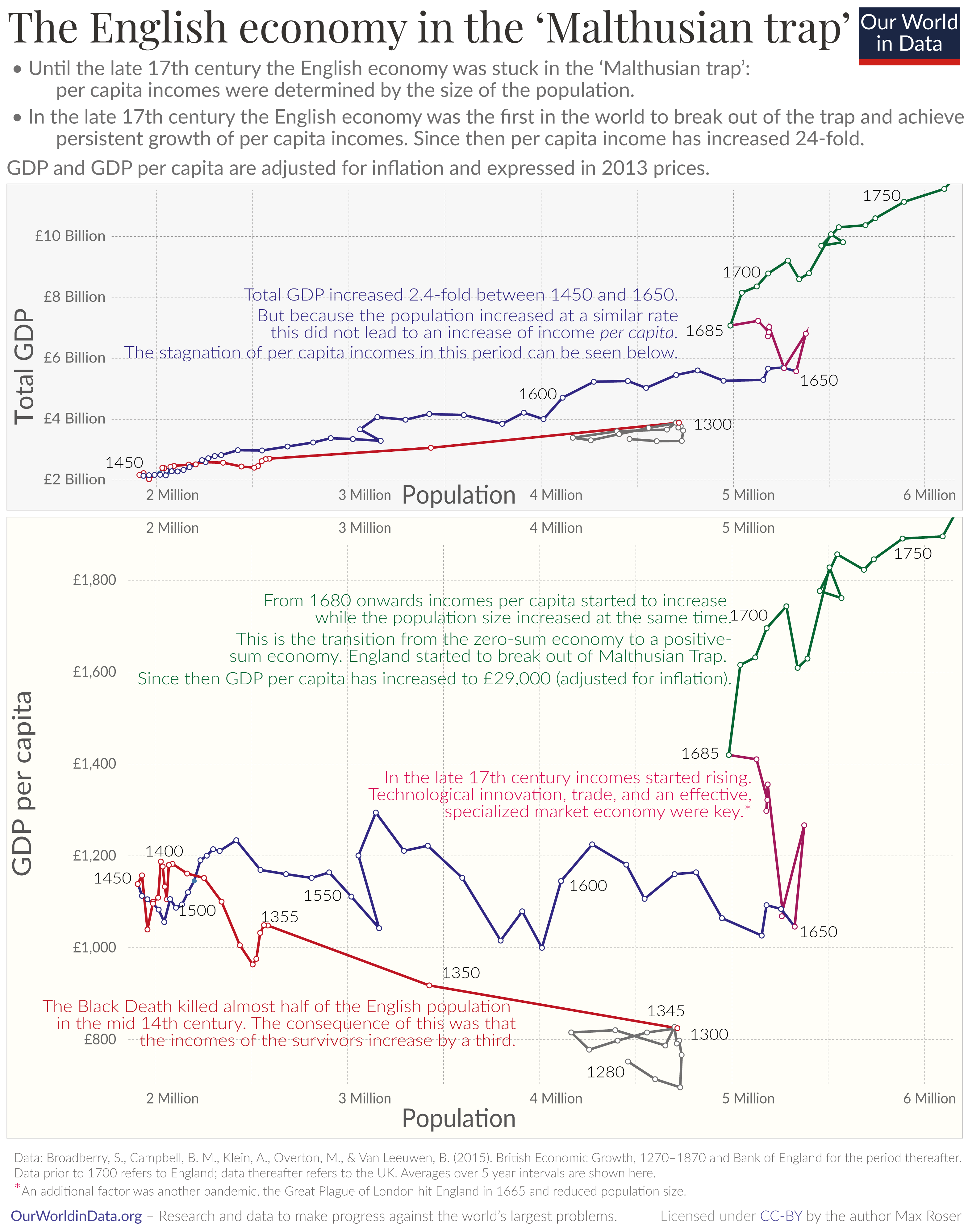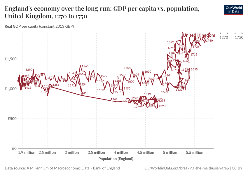 Max Roser (2020) - “Breaking out of the Malthusian trap: How pandemics allow us to understand why our ancestors were stuck in poverty” Published online at OurWorldinData.org. Retrieved from: 'https://archive.ourworldindata.org/20251125-173858/breaking-the-malthusian-trap.html' [Online Resource] (archived on November 25, 2025).BibTeX citation