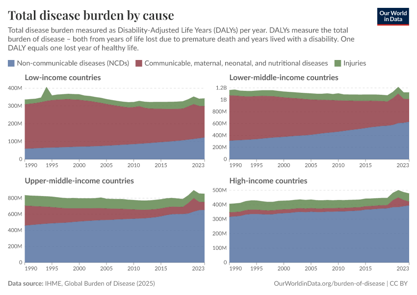 Epidemiologists break the disease burden down into three categories of disability or disease: non-communicable diseases (NCDs); communicable, maternal, neonatal, and nutritional diseases; and injuries. These are shown in the chart below.