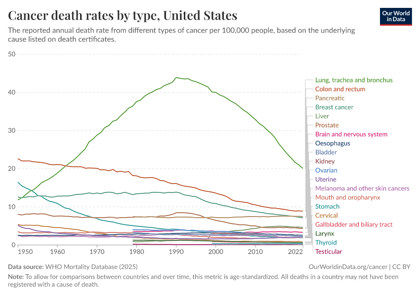 The chart below shows a historical view of reported cancer death rates since 1950 in the United States. You can see several major changes: colorectal and stomach cancer were previously the two most common cancer causes of death, but both have declined greatly over time.