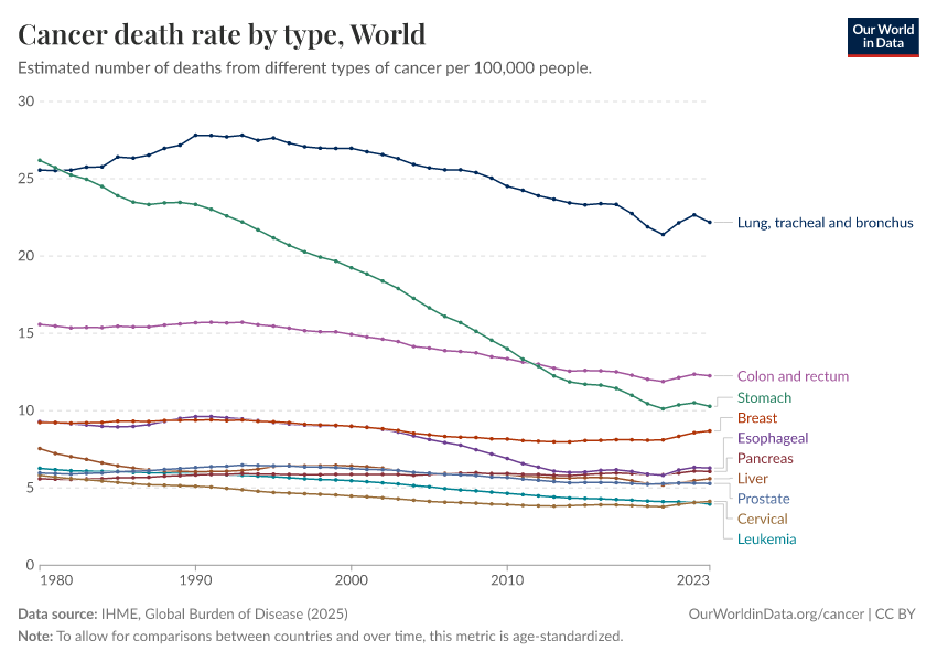Scripts to recreate this chart can be found on GitHub. We published a new version of this chart in May 2025, fixing an error in the data on lymphatic and blood cancers.
