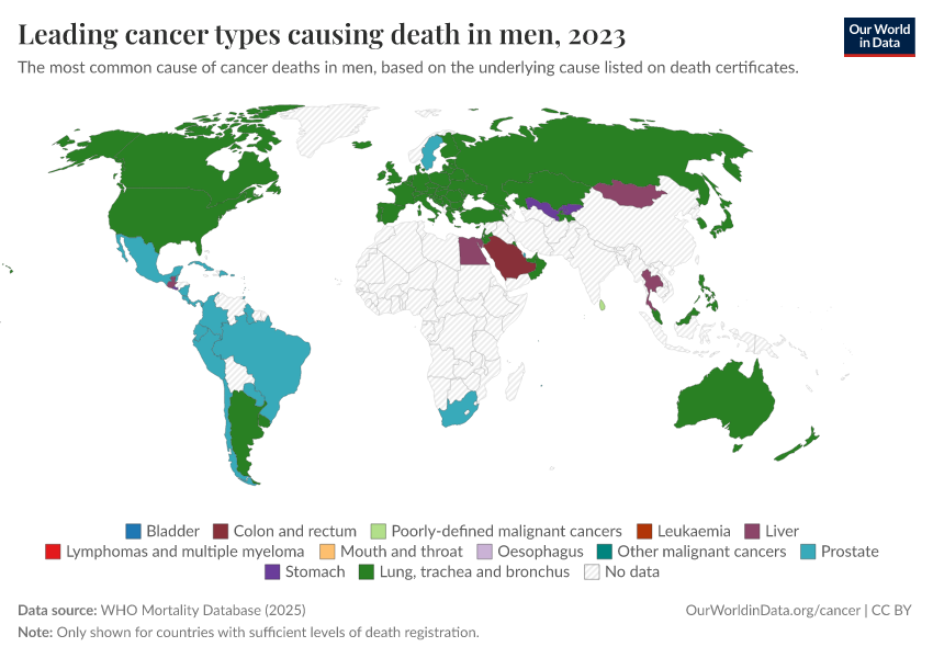 In men, you can see that lung cancer kills the most in many countries. Other cancers — such as prostate, liver, and stomach cancer — are the most common in others.