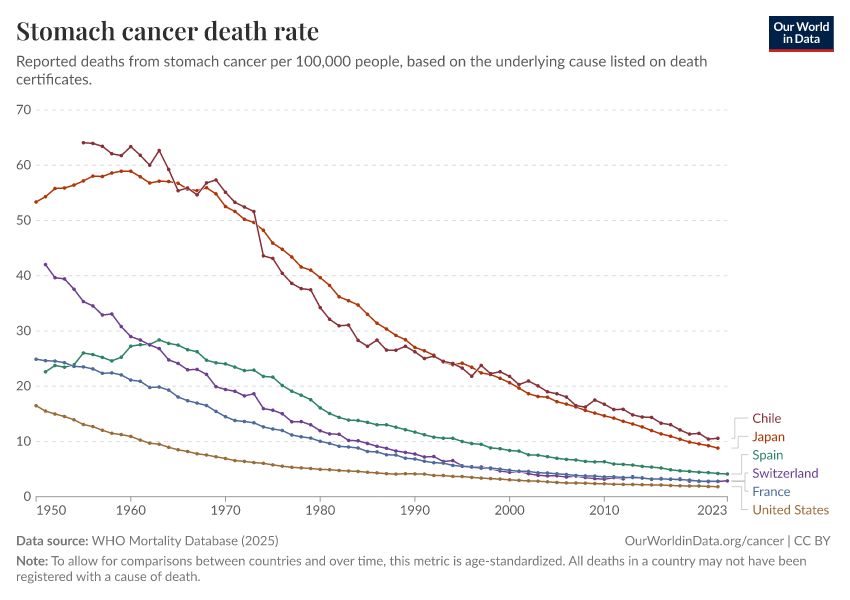 One notable example is stomach cancer, which used to be one of the top causes of cancer death in countries like the United States. But age-standardized death rates from stomach cancer have declined a lot over time, as the chart below shows.