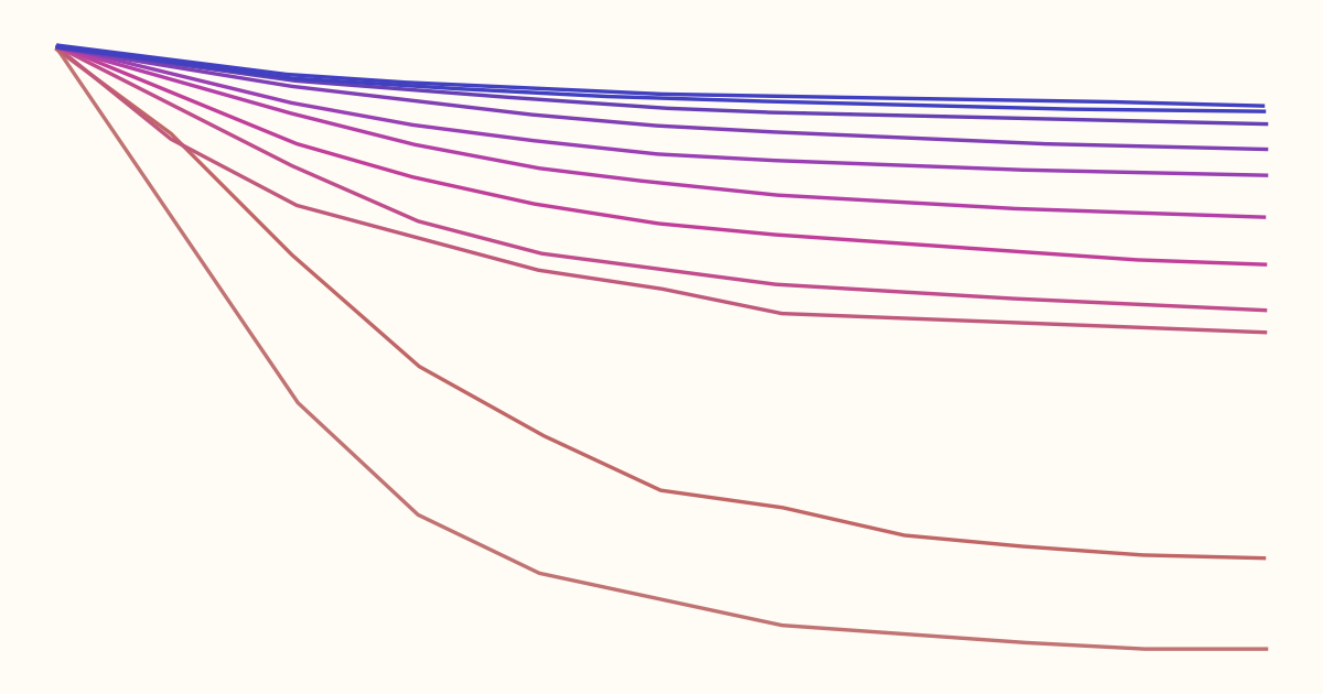The relative share of deaths from each cancer type in this chart is affected by the rise of other cancer types: some cancers may grow rapidly and outrank other cancers on the chart. This is why some cancer types, like colorectal and breast cancer, appear to shrink at the oldest ages, even though their risks actually continue to rise with age.