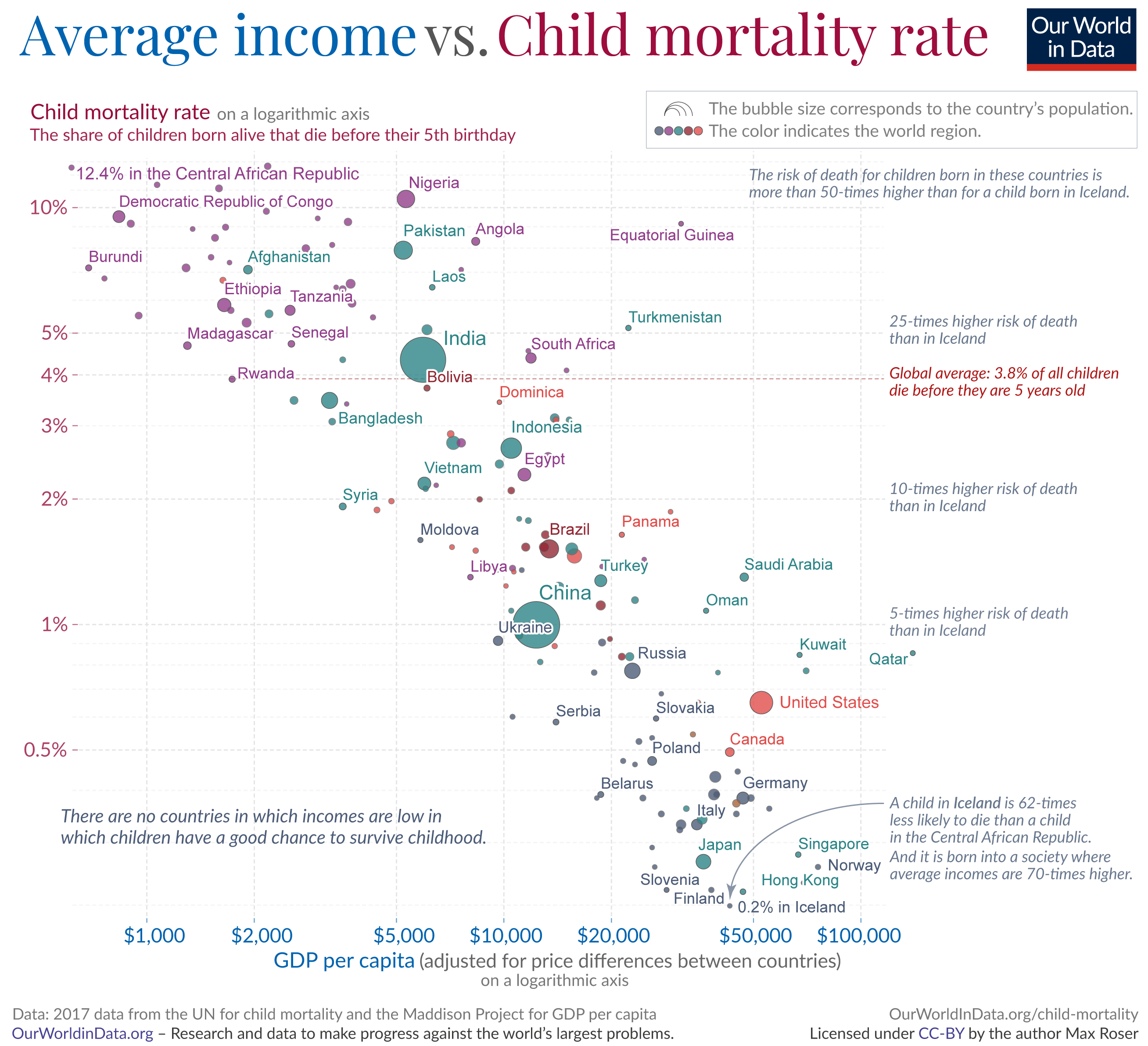 Global inequality: in countries where incomes are very high child mortality is low