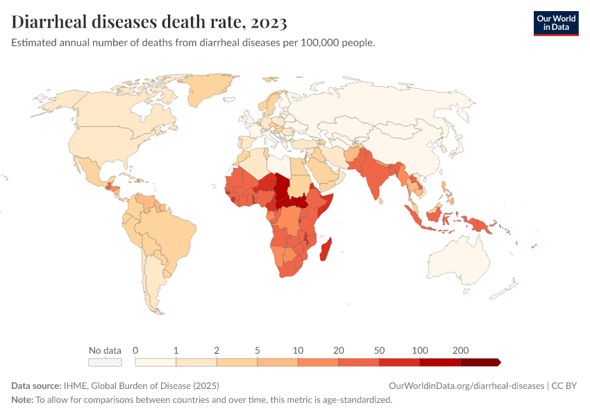Saloni Dattani, Fiona Spooner, Hannah Ritchie, and Max Roser (2023) - “Diarrheal Diseases” Published online at OurWorldinData.org. Retrieved from: 'https://ourworldindata.org/diarrheal-diseases' [Online Resource]BibTeX citation