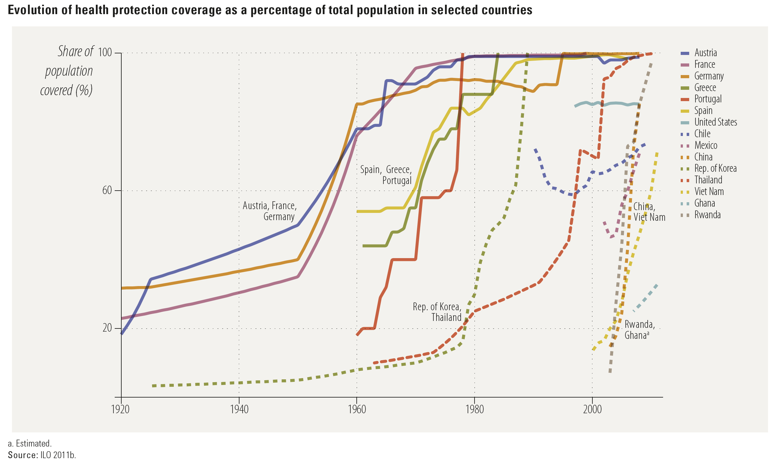 European countries led the expansion of healthcare systems in the early 20th century — countries like France, Austria, and Germany expanded healthcare coverage between 1920 and 1960 — followed by Spain, Portugal, and Greece between 1960 and 1980.