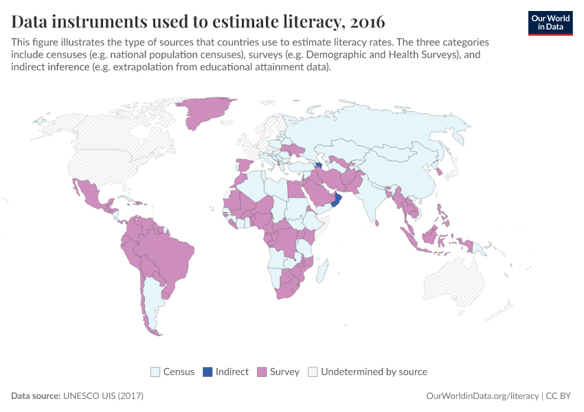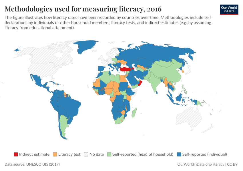 In the chart we present a breakdown of these estimates, showing the main methodologies that countries use to measure literacy, and how these have changed over time. (To explore changes across time use the slider underneath the map.)