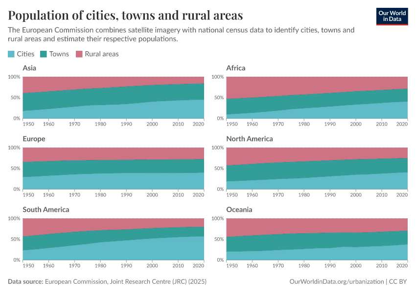 However, the manual on how to apply the Degree of Urbanization recommends reporting figures across three distinct categories—cities, towns, and villages—rather than using a simple urban-rural dichotomy. This approach recognizes urbanization as a continuum, acknowledging that towns occupy a unique position, differing significantly from both cities and villages in their characteristics and needs. The reported cities, and towns population shares by continent are shown in the chart below.