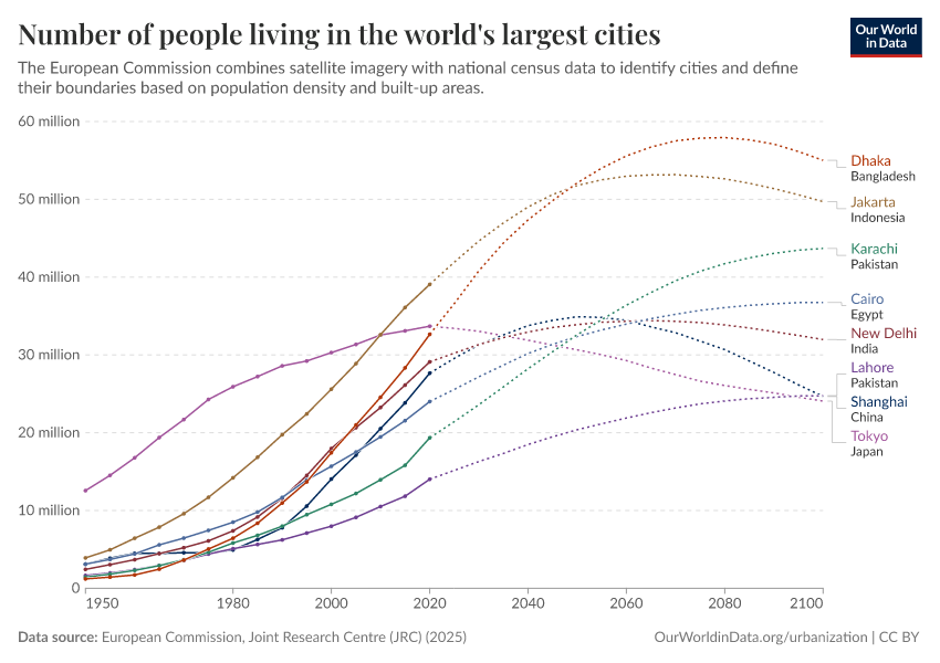 According to the European Commission, Guangzhou — a city in China — was the most populous city in the world, with over 40 million inhabitants. Back in 1975, its population was just over 2 million. Dhaka (the capital of Bangladesh) increased from less than 5 million in 1975 to over 33 million in 2020 (and is projected to reach more than 40 million by 2035).
