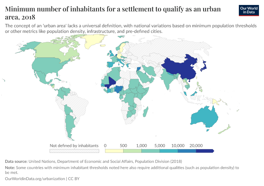 In the table, we highlight the varied definitions across a selection of countries. The UN World Urbanization Prospects database also provides a full downloadable list of statistical definitions for each country.