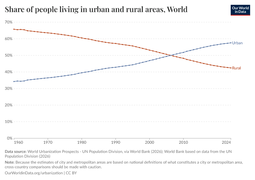 Hannah Ritchie, Veronika Samborska, and Max Roser (2024) - “Urbanization” Published online at OurWorldinData.org. Retrieved from: 'https://ourworldindata.org/urbanization' [Online Resource]BibTeX citation