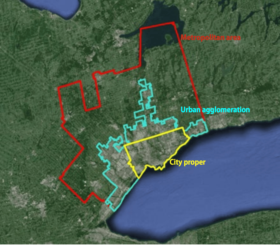 This figure, which shows the urban definition boundaries for Toronto, is used by the UN to demonstrate these differences.17
