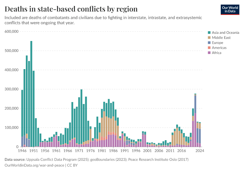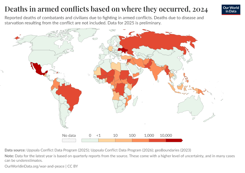 Bastian Herre, Lucas Rodés-Guirao, and Max Roser (2024) - “War and Peace” Published online at OurWorldinData.org. Retrieved from: 'https://ourworldindata.org/war-and-peace' [Online Resource]BibTeX citation