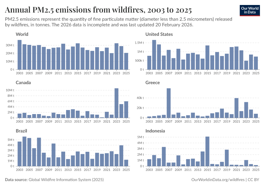 In the chart below, we show estimates of the amount of PM2.5 that is emitted from wildfires across the world.