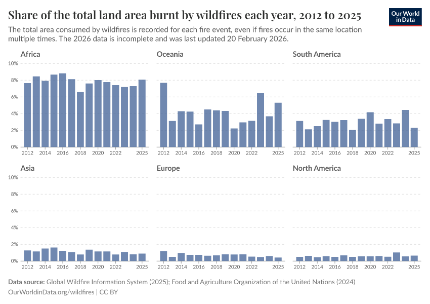 Africa tends to be the region with the largest share of area burned — typically ranging from 6% to 8% each year. Figures tend to be lower in other regions but can vary a lot from year to year.